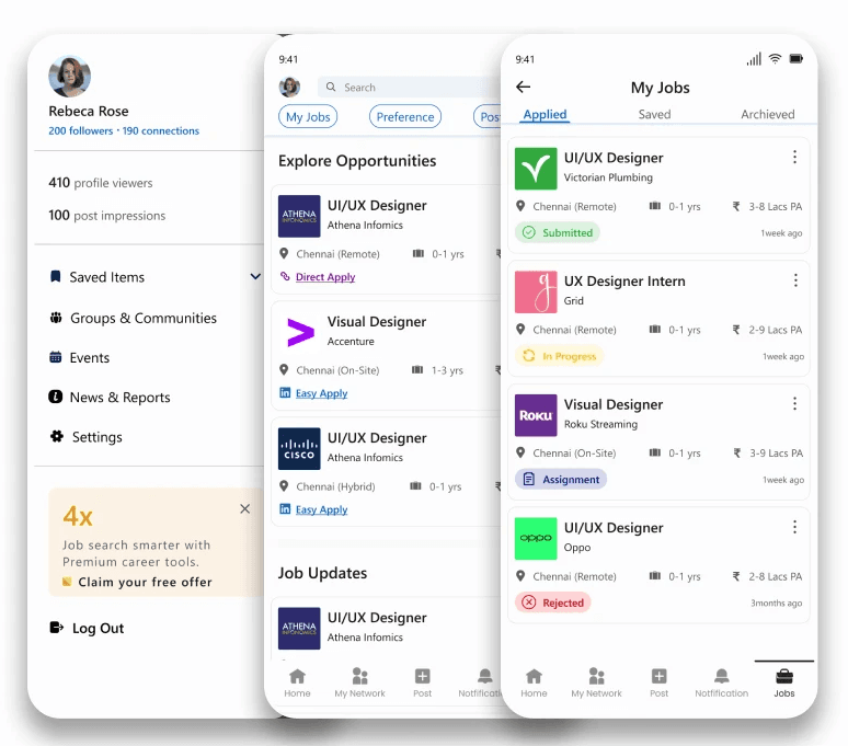 As a UI/UX designer, I identified several pain points users face while navigating the LinkedIn mobile app. These issues include difficulty finding essential tabs, lack of organization for saved items, unclear job card details, and poorly designed screens.